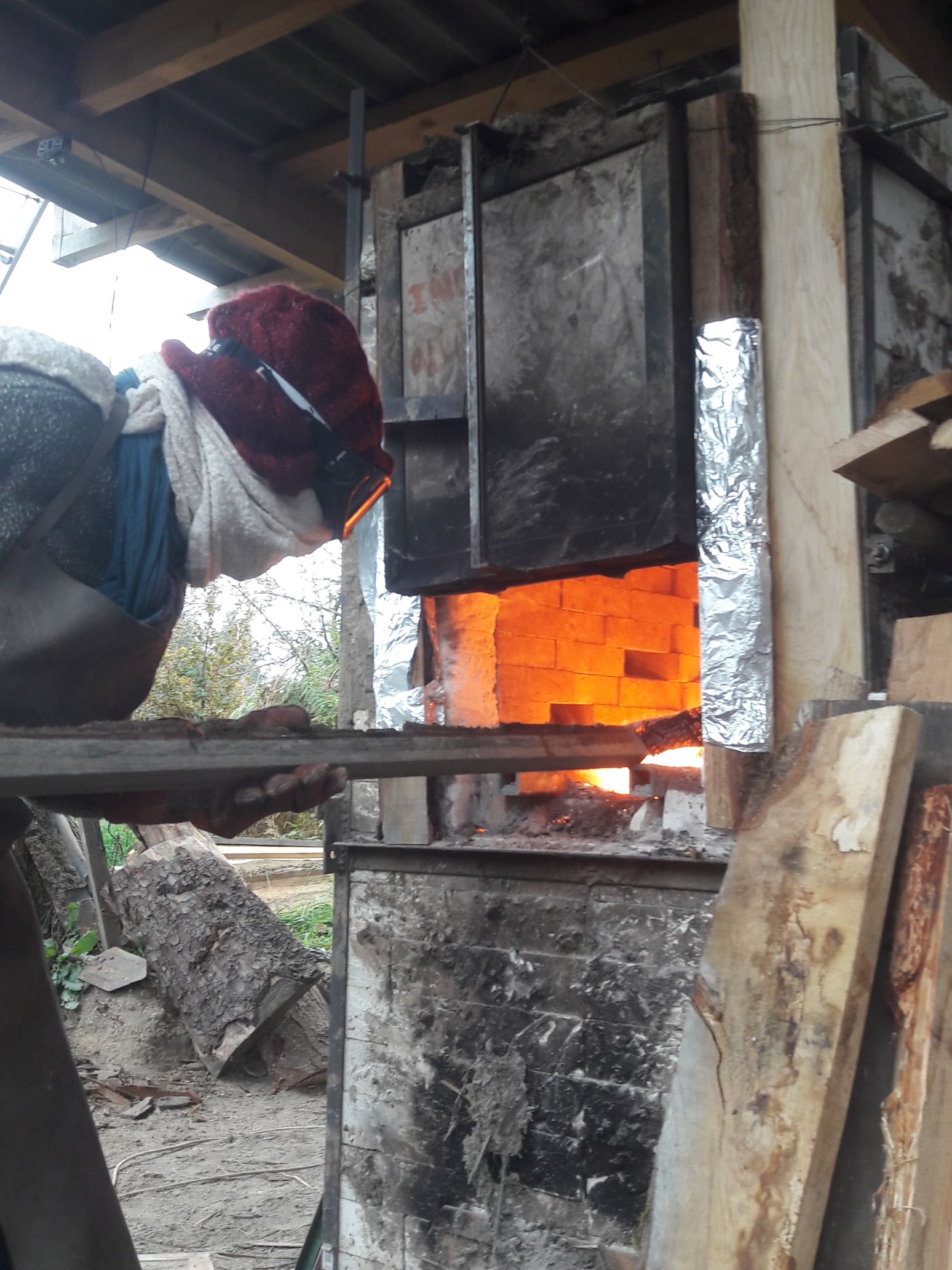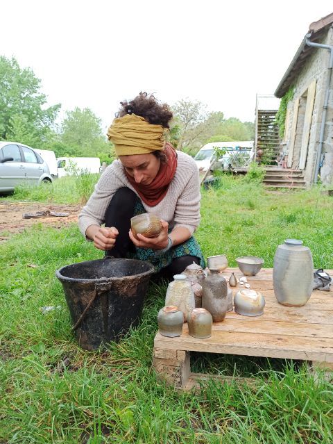 Deux à quatre fois par an, je rejoins une dizaine d’ami.es potier.es chez Tristan Chambaud-Hérault et chaque cuisson dure entre 3 et 5 jours dans de grands fours à bois (anagama et train kiln). En équipe, nous alimentons le feu jusqu’à atteindre 1330°. Le passage des flammes génère naturellement des émaux et nous obtenons différents tons et effets selon les minéraux présents dans les argiles et les cendres.