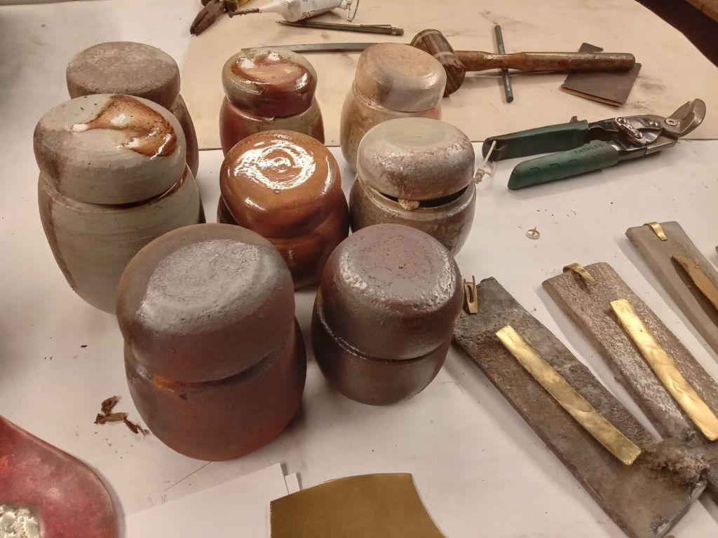 Par la suite, je façonne et grave certains élèments (anse…) en laiton et procède à des finitions à base de laque et d’or (kinsugi).